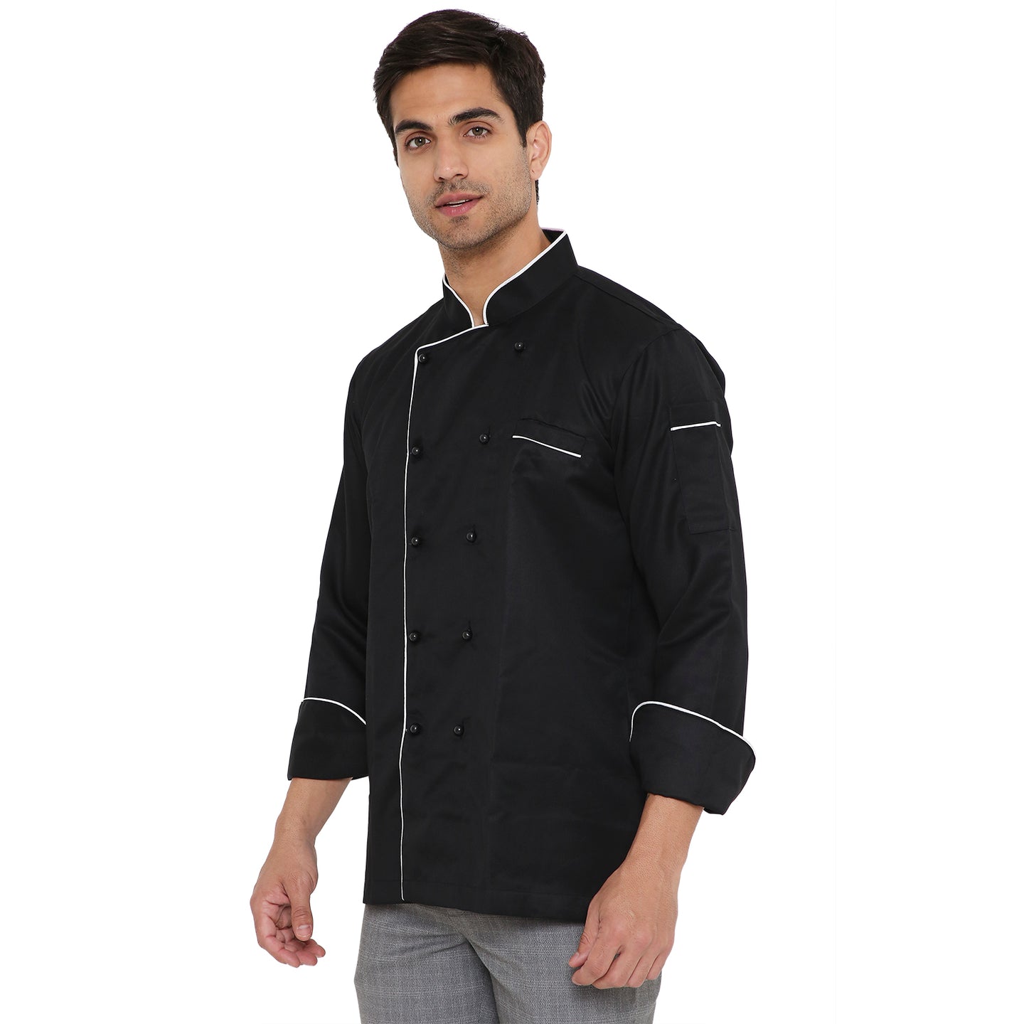 - French Cuff, Double Breasted, Mushroom Buttons, Knife pocket on left hand, Cold Machine Wash